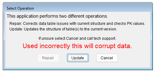 The TARepair application will limit the user input to the "Update" option. Select the Update button to update the DBC to include the indicate view during the TARepair process.