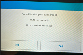If the customer declines the Surcharge by selecting “NO,” the system returns control to the clerk to select another payment method. The transaction is not completed.