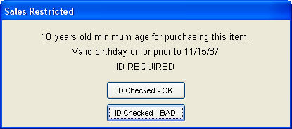 The Sales Restricted screen below appears due to an ID Requirement and the indicated Age Limit. Selecting the ID Checked - OK button indicates that the clerk has confirmed the customer's ID.