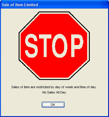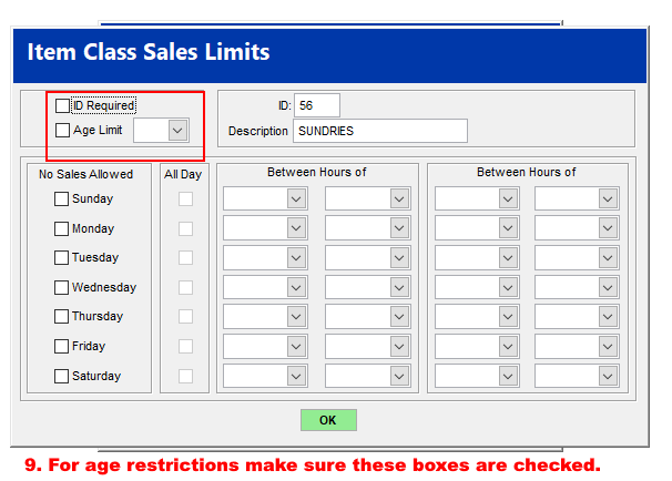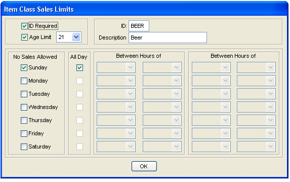 The Sales Limits feature helps control the sale of products based upon requirements of ID, age, day of week and/or time of day. All items assigned to the specified class will acquire the related sales limits.