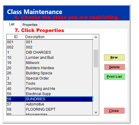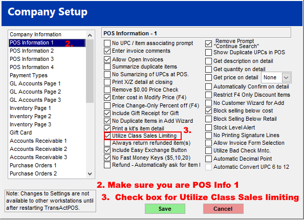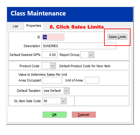 Item Class Sales Limits is activated in System | Company SetUp | Properties | POS Information 1 | Utilize Class Sales Limiting.